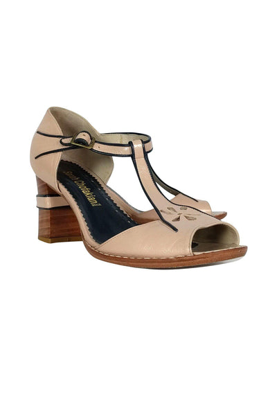 Regular price $39.97Take a step in these feminine nude pink heels from Sarah Chofakian. Designed in a T-strap silhouette with a black leather trim. Detailed accents such as a cut out flower and chunky wood heel adorn these must-have pumps.
